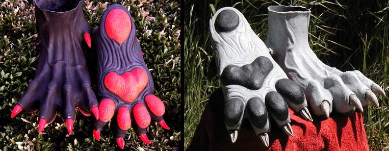 Our basic wolf feet, with your choice of skin, pad and claw color. The combination on the right is light grey skin with black paw pads and white claws; on the left is black skin with red pads and claws. While we call these wolf paws, these hindpaws done in all black make great fox feet.