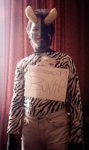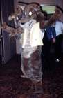 I follow Big Bad Wolf into the presentation run-through and make myself useful as a water boy, snapping a picture of the unofficial CF9 Bunyip. The stage isn't ready for practice, and as the time draws near everyfurry is moved into the back hallway. I meet & help Stanley D. Lion while the presentation order is straightened out. Some higher-up in the hotel staff appears and complains that we're blocking an access/fire hallway, and to make a longer story short, the fursuit prep area gets moved to the Pearl Possum. Robert King & I wind up acting as impromptu traffic control, getting fursuits to the stage in small groups (as we can't overload the access hallway). |