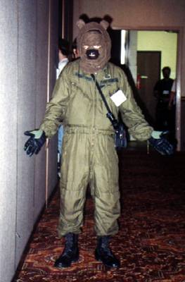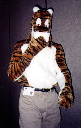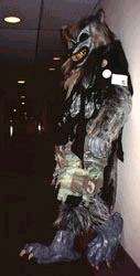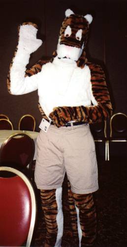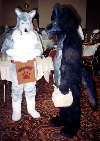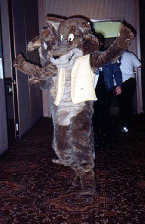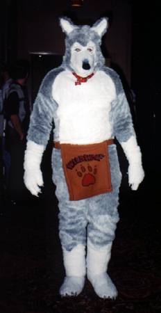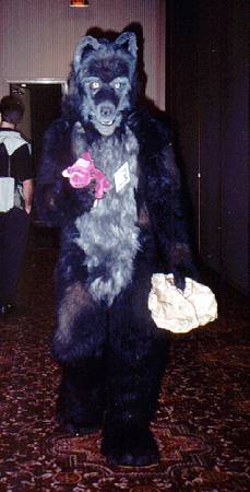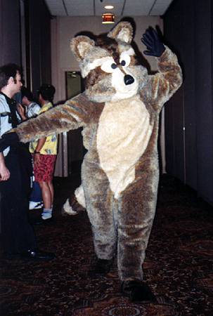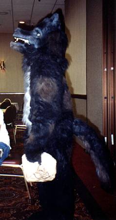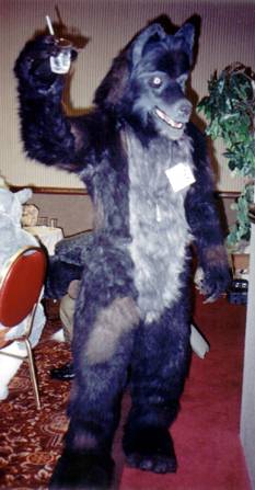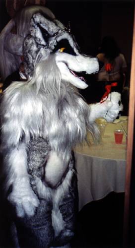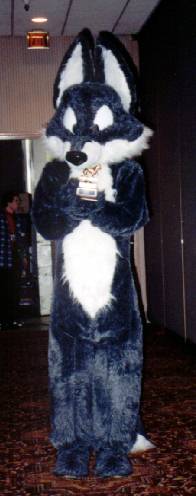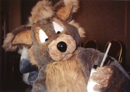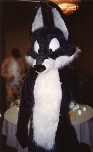 I wake up early and quietly watch a few cartoons while Smash & Dragon sleep on. A breakfast of chocolate covered expresso beans and Sunny D gets the old brain to working. At 11 I have to choose between the Wolf SIG and a fursuit SIG - I head to the fursuit lounge. After an interesting discussion of building fursuits for hire - and construction techniques - it's off to the dealer's room, the only time I saw it while not in costume.