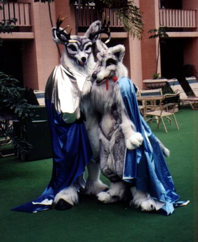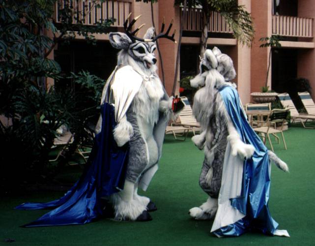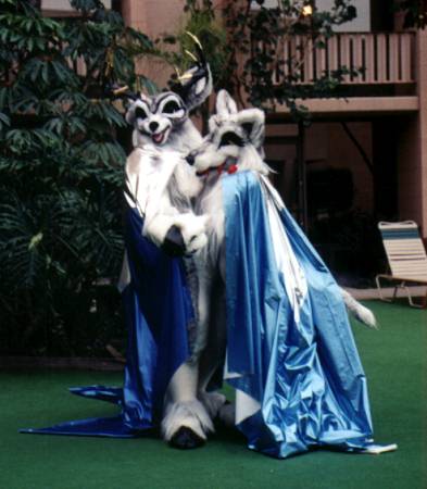 Looking out our room window I see Lance Ikegawa and Heather Riesen posing at poolside in the Frost & Fire fursuits and hotpaw it down to take pictures - wearing Silvermane, of course. Using a viewfinder with a muzzle in the way was a unique experience.