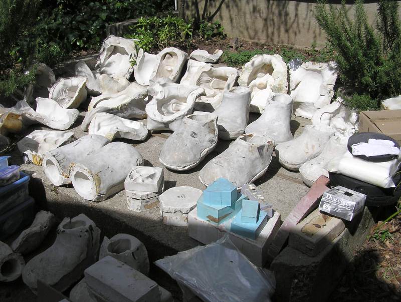 Here's the "back corner" of the workshop, taken a couple of weeks ago. On the table you see a new set of pawpad molds, a set of masters waiting to be remolded, a bucket of claws to have the flashing removed and a pair of paw sculptures from a cancelled project that Ysengrin keeps threatening to finish and mold anyway.
