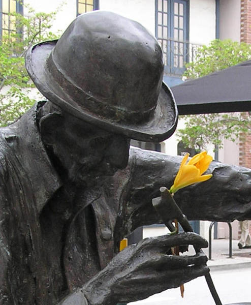 This bronze of the musical-saw-playing labor activist Tom Scribner graces downton Santa Cruz. Fresh flowers are placed daily on the statue by locals. A biography of Tom can be found here (pdf).