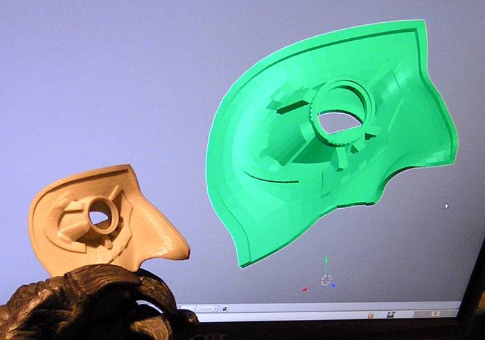 Here are before-and-after images of a new jaw; one is in Blender and only exists virtually, the other is printed in hard plastic. The process allows us to fine tune a jawset to a much greater degree than we could before. We will use the printed jaw as a master and pull a silicone mold from it for actual use.