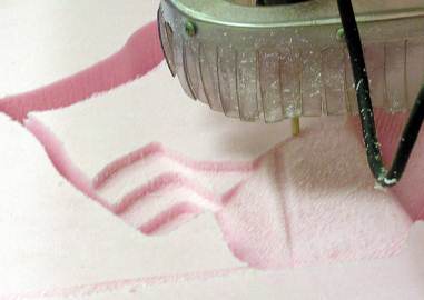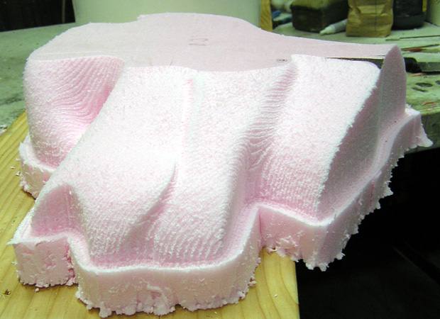 Here's another in-progress photo of a head form. This is pretty much how it looks coming off the ShopBot; you can see the path of the tool as it carved away the foam. The surface could be processed to a much finer finish, but at a cost of considerably more time. It's easier -- and much faster -- to hand sand the foam from this point, especially as we intend to work a layer of clay over it.