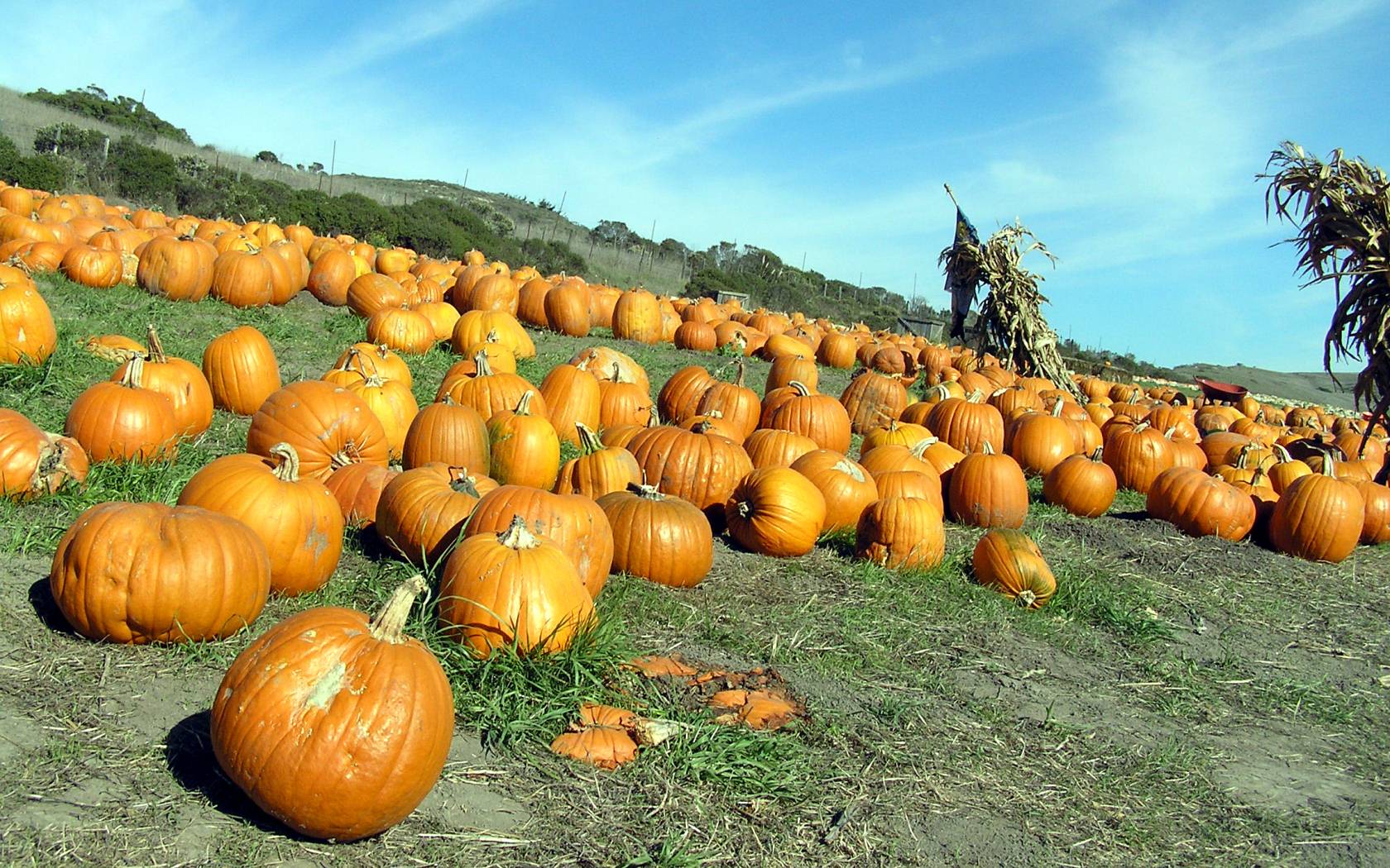 A hillside field of pumpkins overlooking the Pacific Ocean. I'm also including a 1680x1050 wallpaper image of this one, for the season.
