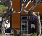 Here are two of the last surviving Circus Trees at the old Lost World site (now a shopping center in Scotts Valley). Once upon a time, these two trees were joined together and shaped into the Double-legged Tree. Sometime after Lost World closed they were cut apart, and when the other surviving trees were relocated this pair was left behind.
