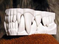 Here's the final jawset as it comes out of the 3D printer. Original model created in Blender. We'll make a silicone mold from these masters and make the actual sets for the head with dental acrylic. For some idea of the size, the largest canines are two inches from gum line to tip. The arrangement of the front teeth are based on a black bear, transitioning to hyena on the back molars.